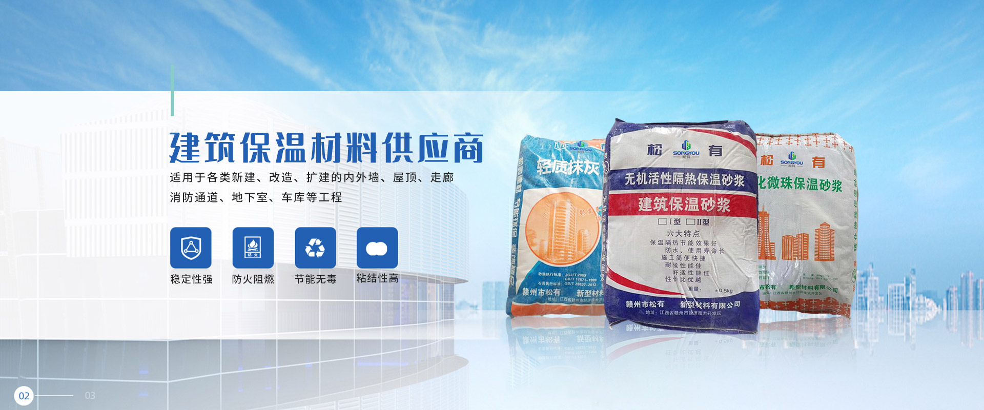 江西松有新型材料有限公司,主要從事保溫材料、防水材料銷售,兼營建筑材料、裝飾材料和金屬材料等銷售,主要產(chǎn)品有巖晶砂、高分子益膠泥、輕質(zhì)抹灰砂漿石膏、防滲抗裂砂漿、玻化微珠保溫砂漿、砌塊砌筑粘接劑、無機活性隔熱保溫砂漿、加氣磚專用砌筑砂漿等。